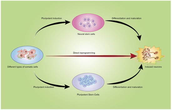 Finding new ways to study diseases and treat neurological disorders is crucial in this urgent situation. Somatic cell reprogramming, a new way to obtain neurons, is one way that scientists are trying to do this. Through somatic cell reprogramming, somatic cells can be transformed into neurons, thereby accelerating research progress and advancing the development of effective neural repair and replacement solutions []. Somatic reprogramming involves transforming one somatic cell type into induced pluripotent cells, which are then matured into the desired cell type. In contrast, transdifferentiation refers to the direct transformation of one somatic cell type into another without first reprogramming into pluripotent cells and then differentiating into functional somatic cells [].