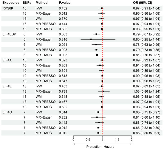As seen in Figure 2, the levels of the genetic proxy EIF4EBP were found to have an inverse association with the risk of PD (OR = 0.79, 95% CI = 0.67–0.92, p = 0.003). The results obtained from WM, MR-PRESSO, and MR-RAPS were consistent, which added confidence to the conclusion that this association is likely causal. Additionally, indicative evidence was found for a potential causal effect of EIF4G levels on the risk of PD, whereby higher levels reduced the risk (OR = 0.85, 95% CI = 0.75–0.97, p = 0.014). Similar causal estimates were also obtained using MR-PRESSO (OR = 0.85, 95% CI = 0.82–0.89, p = 0.012) and MR-RAPS (OR = 0.85, 95% CI = 0.80–0.91, p = 0.012). The detailed instrumental variables in the analysis were listed (Table S1). The impact of individual variables of EIF4EBP and EIF4G on PD was further demonstrated through the scatterplot and forest plot presented in Figure 3. However, the analysis of the effects of RPS6K, EIF4A, and EIF4E levels on the risk of PD did not reach statistical significance. The Cochran’s Q test p-values for all of these were more than 0.05, indicating that no obvious heterogeneity was observed. Furthermore, the MR–Egger regression intercept showed no evidence of unbalanced pleiotropy (all p > 0.05) (Table 1). The global test of MR-PRESSO also did not identify any pleiotropic bias. In addition, the absence of any significant SNPs in the leave-one-out sensitivity analysis (Figure 4) suggests that no individual SNP could disrupt the causal relationship.