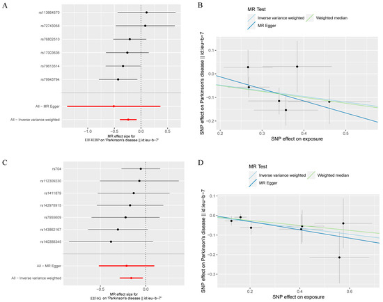 MR analyses of genetic proxied EIF4EBP and EIF4G levels on the risk of PD. The forest plot (A) and the scatterplot (B) of the MR analysis of EIF4EBP and PD. The forest plot (C) and the scatterplot (D) of the MR analysis of EIF4G and PD.