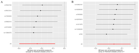 Leave-one-out analysis for the estimates of EIF4EBP (A) and EIF4G (B) on PD.