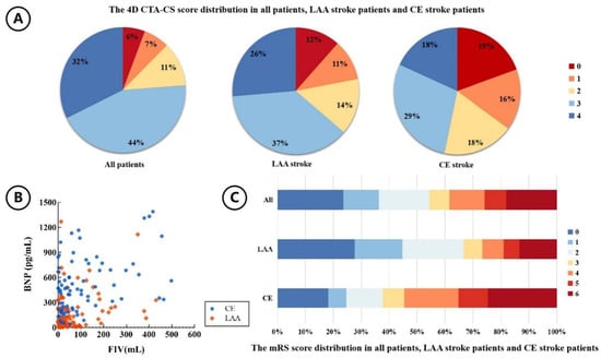 The following supporting information can be downloaded at: https://www.mdpi.com/article/10.3390/brainsci13040539/s1, Table S1: CE stroke Patient Characteristics at Baseline; Table S2: LAA stroke Patient Characteristics at Baseline; Figure S1: mRS scors at 3 month by 4D CTA in all patients, LAA stroke patients and CE stroke patients; Figure S2: mRS scors at 3 month by BNP in all patients and CE stroke patients.
