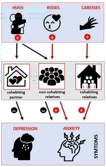 Moreover, we reported that the frequency of hugs with the cohabiting partner significantly decreased the symptoms of depression. This finding is in line with the results of Field et al. (2020) who reported that the frequency of touch with partners was related to lower levels of depressive symptoms during the U.S. COVID-19 lockdown. This effect is likely attributable to the well-documented increase in oxytocin levels that occurs when more hugs are received from the partner [10,11]. In addition, another line of research suggests that high and low levels of oxytocin are associated with high and low levels of depressive symptoms, respectively (for a review see: McQuaid et al., 2014). On the other hand, we found that the frequency of caresses with cohabiting relatives and the frequency of hugs and kisses with non-cohabiting relatives predicted symptoms of anxiety (Figure 1).