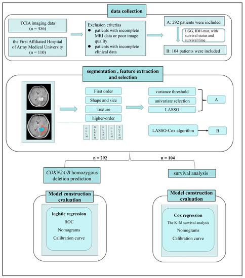 This retrospective study included 566 patients from 2 different cohorts: the public database platform for cancer imaging—The Cancer Imaging Archive (TCIA)—with a search deadline in March 2021, and the First Affiliated Hospital of Army Medical University from January to September 2019. The need for informed consent from all patients in both cohorts was waived, and this study passed the ethics review of the First Affiliated Hospital to the Army Medical University. The inclusion criteria were as follows: patients with (1) pathologically confirmed gliomas, (2) conventional MRI sequences (fluid-attenuated inversion recovery [FLAIR], gadolinium-enhanced T1-weighted [Gd-T1W] MR), (3) CDKN2A/B homozygous deletion testing, and (4) general clinical information (age, sex, WHO Central Nervous System tumor classification, and histological category). The exclusion criteria were as follows: (1) lack of preoperative MR images in the postoperative MRI scan, (2) lack of either sequence in FLAIR or Gd-T1W MR, (3) presence of MRI artifacts, and (4) incomplete clinical information. Based on these criteria, 292 patients were enrolled in the first step of this study, in which imaging analysis of CDKN2A/B homozygous deletion was performed. In the following phase of this study, 104 patients with low-grade IDH-mutant gliomas were screened from the 292 enrolled patients. Clinical information such as survival status and survival period were collected for prognosis and survival analysis. For both objectives, we adapted a 7:3 random partition to divide the data into the training and validation sets. The workflow of this study is shown in (Figure 1).