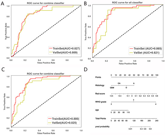 Establishment and validation of the predictive model of CDKN2A/B homozygous deletion in glioma. (A–C): The receiver operating characteristic results of the models. (A) clinical model, (B) radiomics model, (C) the combined clinical and radiomics comprehensive prediction model. (D) Nomogram of the combined prediction model of CDKN2A/B homozygous deletion: the relevant clinical characteristics and rad-score were included in the nomogram, and the results showed that rad-score correlated most strongly with the model.