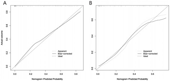 Calibration curves for the prediction model of CDKN2A/B homozygous deletions. (A) Training set and (B) Validation set.