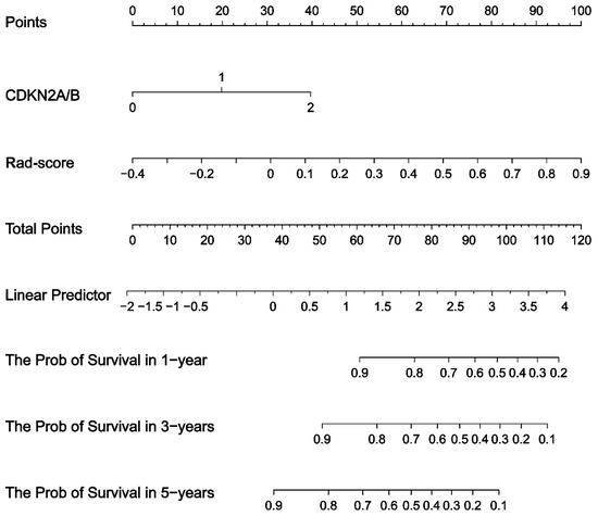 Nomogram of the training set of survival analysis: survival rate at 1-, 3-, and 5-years can be calculated from CDKN2A/B homozygous deletion status and rad-score.