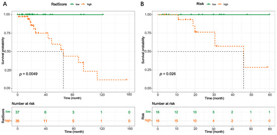 Kaplan–Meier curves with isocitrate dehydrogenase-mutant low-grade glioma. (A) Training set and (B) Validation set. Mortality was higher in the high-risk group, whereas almost no patients died in the low-risk group (p-value was 0.026 in the training group and 0.0049 in the validation group). The number at risk means the number of people in the high and low groups who were not censored from the endpoint event at different times.