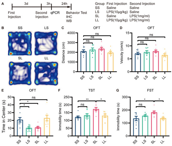 Low-dose LPS preconditioning exerted antidepressant-like effects. (A) Experimental schema. Low-dose LPS (10 μg/kg) or saline was administered before a second injection of high-dose LPS (1 mg/kg) or saline 3 days later, and behavioral tests were performed 24 h after the second injection (n = 8). Depressive-like behaviors were evaluated by measuring the total distance traveled (B,C), velocity (D), and total time spent at the center (E) in the OFT, and immobility time in the TST (F) and FST (G). The data were presented as the mean ± SEM; one-way ANOVA, ns indicated no significance, * p < 0.05; ** p < 0.01.