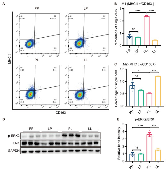 The effect of low−dose LPS pretreatment on phenotypic transition in BV2 microglia. (A) Representative graph of flow cytometry results. MHC Ⅱ and CD163 were used to identify M1 and M2 microglia, respectively. MHC Ⅱ (B) and CD163 (C) protein expression was measured via flow cytometry. M1 microglial polarization was reduced and M2 microglial polarization was promoted in the LL group compared to the PL group (n = 3). (D) Representative Western blots of p−ERK2 and ERK in BV2 microglia; the level of each protein was normalized to the GAPDH level (n = 3). (E) Statistical analysis showed that the phosphorylation of the ERK protein in BV2 microglia was decreased in the LL group compared to the PL group. The data were presented as the mean ± SEM; one-way ANOVA, ns indicated no significance, * p < 0.05; *** p < 0.001; **** p < 0.0001.