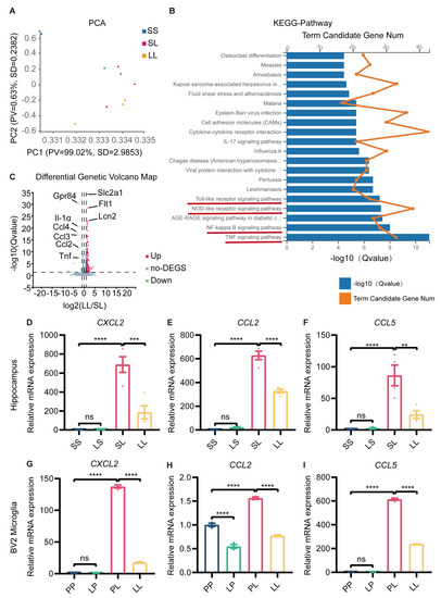 Transcriptional profile changes in tolerance-like mice. (A) PCA separated the sample into three clusters (SS, SL, LL), which coincided with the real situation (n = 3). (B) KEGG pathway analysis of differentially expressed genes between the SL and LL groups. (C) Volcano plot of differentially expressed genes between the SL and LL groups. Genes above the significance threshold (Padj < 0.05, Log2 FC > 2) were colored green and red. (D–F) mRNA expression levels of CXCL2, CCL2, and CCL5 in the mouse hippocampus (n = 4). (G–I) mRNA expression levels of CXCL2, CCL2, and CCL5 in BV2 microglia (n=3). The data were presented as the mean ± SEM; one-way ANOVA, ns indicated no significance, ** p < 0.01; *** p < 0.001; **** p < 0.0001.