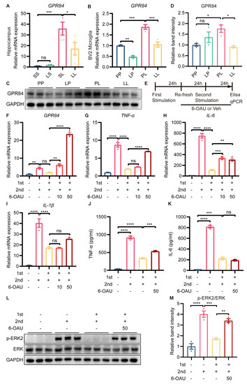 Effect of GPR84 activation on LPS−induced microglial tolerance−like state. GPR84 mRNA expression in the mouse hippocampus (n = 4) (A) and in BV2 microglia (n = 3) (B). (C) Representative Western blots of GPR84 and the normalization control GAPDH in BV2 microglia. (D) Statistical analysis showed that the expression of GPR84 protein in BV2 microglia was increased in the PL group compared to the PP group, but decreased in the LL group compared to the PL group (n = 3). (E) Schematic diagram of the 6−OAU treatment experiment. “+” referred to LPS treatment, “-“ referred to saline/vehicle treatment, “10” referred to 10 μM, and “50” referred to 50 μM. (F–I) mRNA expression levels of GPR84, TNFα, IL−6 and IL−1β in BV2 microglia. (J,K) Protein levels of TNFα and IL-6 in the cell culture supernatant (n = 3). (L) Representative Western blots of p−ERK2 and ERK in BV2 microglia; the level of each protein was normalized to the GAPDH level (n = 3). (M) Statistical analysis showed that the phosphorylation of the ERK protein in BV2 microglia was increased in the LL + 6OAU group compared to the LL + vehicle group. The data were presented as the mean ± SEM; one−way ANOVA, ns indicated no significance, * p < 0.05; ** p < 0.01; *** p < 0.001; **** p < 0.0001.