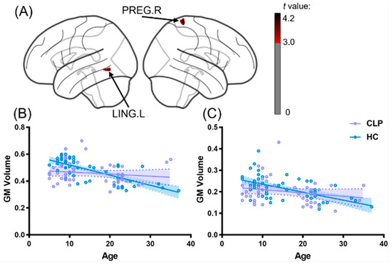 Figure 2. Specific gray matter (GM) regions showed significantly different correlations with age between CLP and HC. (A) Anatomical locations of brain regions whose GM volume exhibited significant interaction effects between group and age, including the left lingual cortex (LING.L) and the right precentral cortex (PREG,R); (B) age slopes of regional GM volume in LING.L in CLP and HC; (C) age slopes of regional GM volume in PREG.R in CLP and HC. Gender and total intracranial volume (TIV) were regressed out as covariates, and significance is set at cluster-wise Gaussian theory field (GRF)-corrected p < 0.05.