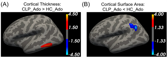 3.3. The Differences in Cortical Thickness and Cortical Surface between CLP and Healthy Controls across Development