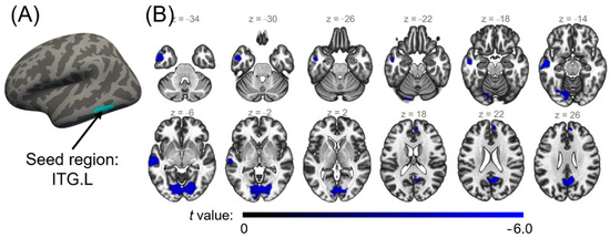 Figure 5. Decreased seed-based functional connectivity in CLP participants compared with HC. (A) The left inferior temporal cortex (ITG.L) was set as the seed, and the cortical thickness exhibited a significant “group × age” interaction effect.(B) Significantly decreased connectivity of CLP participants compared to HC in the functional connectivity analysis with ITG.L as the seed. Gender and age were regressed out as covariates, and significance was set at cluster-wise p < 0.05 with family-wise error (FWE) correction for multiple comparisons.