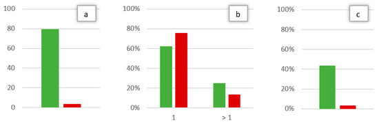 Values with a statistically significant difference between cohort A (OC, in green) and B (ED, in red): Time from symptom onset to first evaluation in days (a), percentage of maneuvers necessary for the resolution of the hc-BPPV-cu (one or more than one) (b), percentage of patients with mc-BPPV at the time of hc-BPPV-cu diagnosis (c).