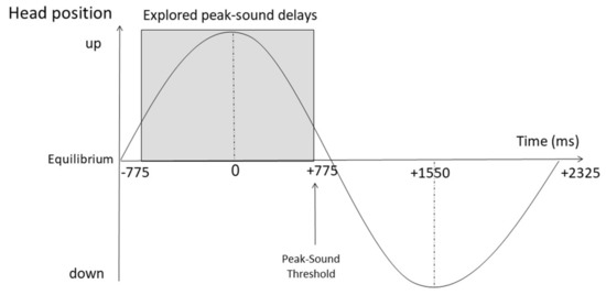 The comparison between sound and vestibular input processing delays has been widely studied [14,23]. A movement perception has a longer processing delay compared to a sound perception: in fact, a sound has to be presented after an unpredictable movement in order to be perceived as simultaneous [23]. In pendular movements, with a predictable periodicity, anticipation appears to modify the delays [24]. Hence, in our protocol, sounds emitted before the movement reference point (head at its peak) were perceived as synchronous.