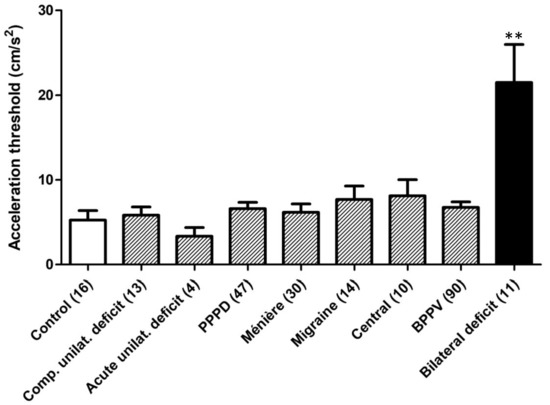 Acceleration thresholds were not affected by gender (6.9 ± 0.52 cm/s2, n = 159 in women versus 8.0 ± 0.90, n = 77 in men, p = 0.6021, Mann–Whitney test). However, they tended to be higher in senior patients (9.7 ± 9.60 cm/s2, n = 68 ≥ 70 years versus 6.4 ± 5.46, n = 152 for <70 years, p = 0.0812, Mann–Whitney test). As expected, patients with bilateral vestibulopathy had higher thresholds than those in the other diagnostic categories did (21.5 ± 14.91 cm/s2, n = 11 versus 5.3 ± 4.47 in controls, n = 16, adjusted p = 0.0033, Kruskall–Wallis test followed by Dunn’s test for multiple comparisons to control group), but other diagnostic categories such as unilateral deficit did not seem to modify this parameter (Figure 4).