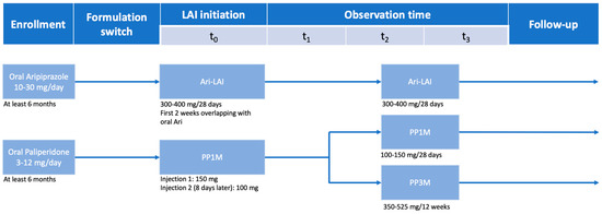Participants received either aripiprazole or paliperidone treatment, first as an oral formulation and then as LAI every 1 or 3 months (i.e., Ari-LAI, PP1M, PP3M), according to clinical judgment and without any study influence. Patients were switched to PP3M after 12 consecutive months of PP1M treatment with a satisfying response. The dosage range for oral formulations varied between 10 and 30 mg/day for aripiprazole and 3–12 mg/day for paliperidone, while the LAI formulations ranged for Ari-LAI, PP1M and PP3m, respectively, 300–400 mg/28 days, 100–150 mg/28 days, and 350–525 mg/12 weeks, according to good clinical practice evaluation (Figure 1).