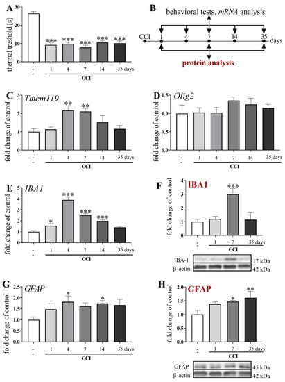 Development of thermal hypersensitivity in CCI-exposed mice (from 1 to 35 days) as measured via the cold plate test (B). Timeline of tissue collection at the indicated time points for behavioral and biochemical analyses (D). Time-dependent changes in the mRNA levels of Olig2 (A), TMEM119 (C), IBA1 (E), and GFAP (G) measured via RT-qPCR, and in the protein levels of IBA1 (F) and GFAP (H) measured via Western blot in the spinal cord of naive and CCI-exposed mice (from 1 to 35 days). The data (n = 5–10) are presented as the mean fold changes relative to the control ± SEM for the biochemical assays and the mean ± SEM for the behavioral tests. The results were evaluated using one-way ANOVA followed by Bonferroni’s post hoc test for comparisons of selected pairs. * p < 0.05; ** p < 0.01; and *** p < 0.001 indicate significant differences vs. the naive group. Abbreviations: -: naive; CCI: chronic constriction injury of the sciatic nerve.