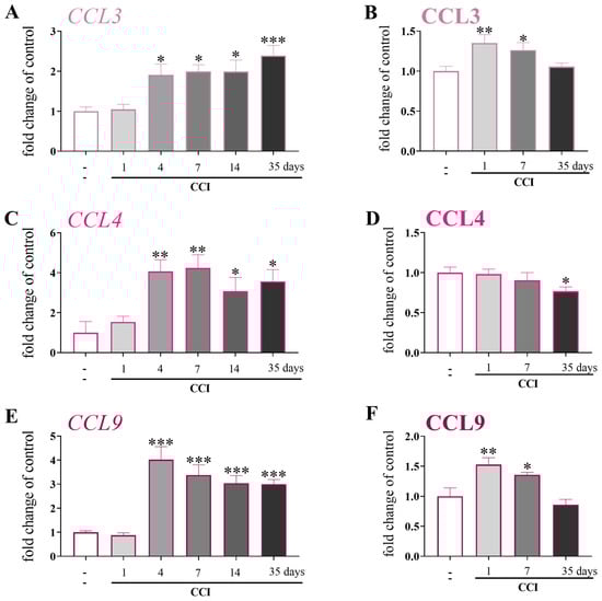 Time-dependent changes in the mRNA levels of CCL3 (A), CCL4 (C), and CCL9 (E) measured via RT-qPCR and changes in the protein levels of CCL3 (B), CCL4 (D), and CCL9 (F) measured using ELISA in the spinal cord of naive and CCI-exposed mice (from 1 to 35 days). The data are presented as the mean fold changes relative to the control ± SEM (n = 4–10). The results were evaluated using one-way ANOVA followed by Bonferroni’s post hoc test for comparisons of selected pairs. * p < 0.05, ** p < 0.01, and *** p < 0.001 indicate significant differences vs. the naive group. Abbreviations: -: naive; CCI: chronic constriction injury of the sciatic nerve.