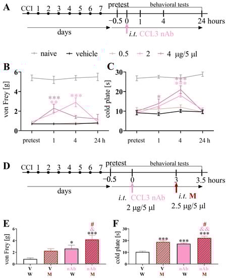 The i.t. administration of CCL3 neutralizing antibody (2 μg/5 μL) followed by the i.t. administration of morphine (TEVA; Krakow; Poland; 2.5 μg/5 μL) was performed 7 days after CCI. The dose of nAb was chosen based on the results obtained from the above experiment. The doses of opioid were chosen based on our previous study []. First, animals received V or CCL3 nAb. Next, after 3 h, there was a second injection of aqua pro injectione (W) or morphine (M). The von Frey and cold plate tests were performed 0.5 h after the second administration (W or M), which was 3.5 h after the first administration (V or CCL3 nAb)