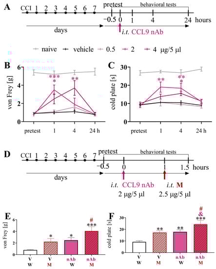 The effects of CCL9 neutralizing antibody administered intrathecally (i.t.) according to timeline (A), at doses of 0.5, 2, and 4 μg/5 μL on mechanical (B) and thermal (C) hypersensitivity, and the influence of a CCL9 neutralizing antibody at a dose of 2 μg/5 μL plus morphine 2.5 μg/5 μL on mechanical (E) and thermal (F) hypersensitivity, administered according to timeline (D), 7 days CCI in mice. The data are presented as the mean ± SEM (naive n = 5; CCI n = 5–8). The results were evaluated using one-way ANOVA followed by Bonferroni’s post hoc test for comparisons of selected pairs. * p < 0.05, ** p < 0.01, and *** p < 0.001 indicate significant differences vs. V-treated group at each of the investigated time points: 1, 4, and 24 h for (B,C) graphs; * p < 0.05, ** p < 0.01, and *** p < 0.001 indicate significant differences vs. V + W-treated group for (E,F) graphs; # p < 0.05 indicates significant differences between the V + M- and nAb + M-treated groups for (E,F) graphs; and & p < 0.05 indicates significant differences between the nAb + W- and nAb + M-treated groups. Abbreviations: V: vehicle (PBS); W: vehicle (aqua pro injectione); nAb: neutralizing antibody; M: morphine; CCI: chronic constriction injury of the sciatic nerve.
