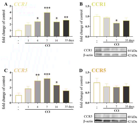 Time-dependent changes in the mRNA levels of CCR1 (A) and CCR5 (C) measured via RT-qPCR and changes in the protein levels of CCR1 (B) and CCR5 (D) measured using Western blot in the spinal cord of naive and chronic CCI-exposed mice (from 1 to 35 days). The data are presented as the mean fold changes relative to the control ± SEM (n = 4–9). The results were evaluated using one-way ANOVA followed by Bonferroni’s post hoc test for comparisons of selected pairs. * p < 0.05, ** p < 0.01, and *** p < 0.001 indicate significant differences vs. the naive group. Abbreviations: -: naive; CCI: chronic constriction injury of the sciatic nerve.