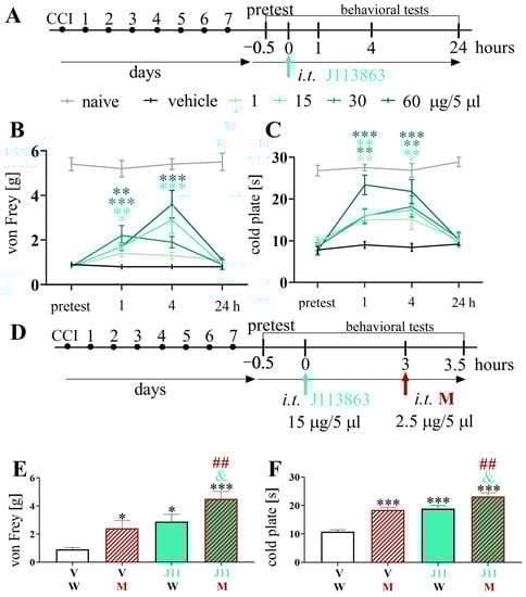 The effects of a CCR1 antagonist (J113863) administered intrathecally (i.t.) according to timeline (A), at doses of 1, 15, 30, and 60 µg/5 µL on mechanical (B) and thermal (C) hypersensitivity and the influence of J113863 at a dose of 15 μg/5 μL plus morphine 2.5 μg/5 μL on mechanical (E) and thermal (F) hypersensitivity, administered according to timeline (D), 7 days after CCI in mice. The data are presented as the mean ± SEM (naive n = 5; CCI n = 5–8). The results were evaluated using one-way ANOVA followed by Bonferroni’s post hoc test for comparisons of selected pairs. * p < 0.05, ** p < 0.01, and *** p < 0.001 indicate significant differences vs. V-treated group at each of the investigated time points: 1, 4, and 24 h for (B,C) graphs; * p < 0.05 and *** p < 0.001 indicate significant differences vs. V + W-treated group for (E,F) graphs; ## p < 0.01 indicates significant differences between the V + M- and J11 + M-treated groups for (E,F) graphs; and & p < 0.05 indicates significant differences between the J11 + W- and J11 + M-treated groups. Abbreviations: V: vehicle (DMSO); W: vehicle (aqua pro injectione); M: morphine, J11: J113863; CCI: chronic constriction injury of the sciatic nerve.