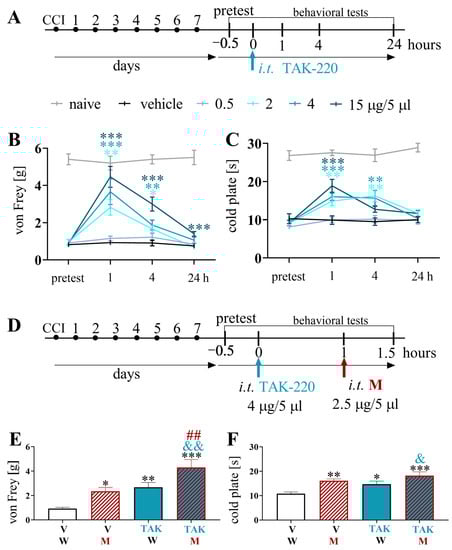 The effects of CCR5 antagonists (TAK-220) administered intrathecally (i.t.) according to timeline (A), at doses of 0.5, 2, 4, and 15 µg/5 µL on mechanical (B) and thermal (C) hypersensitivity and the influence of TAK-220 at a dose of 4 μg/5 μL plus morphine 2.5 μg/5 μL on mechanical (E) and thermal (F) hypersensitivity, administered according to timeline (D), 7 days after CCI in mice. The data are presented as the mean ± SEM (naive n = 5; CCI n = 8–10). The results were evaluated using one-way ANOVA followed by Bonferroni’s post hoc test for comparisons of selected pairs. * p < 0.05, ** p < 0.01, and *** p < 0.001 indicate significant differences vs. V-treated group at each of the investigated time points: 1, 4, and 24 h for (B,C) graphs; * p < 0.05, ** p < 0.01, and *** p < 0.001 indicate significant differences vs. V + W-treated group for (E,F) graphs; ## p < 0.01 indicates significant differences between the V + M- and TAK + M-treated groups for (E,F) graphs; and & p < 0.05 and && p < 0.01 indicate significant differences between the TAK + W- and TAK-220 + M-treated groups. Abbreviations: V: vehicle (DMSO); W: vehicle (aqua pro injectione); M: morphine, TAK: TAK-220; CCI: chronic constriction injury of the sciatic nerve.