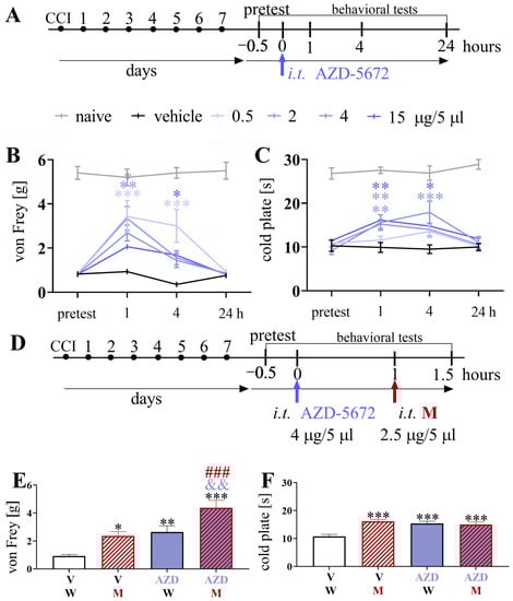 The effects of CCR5 antagonists (AZD-5672) administered intrathecally (i.t.) according to timeline (A), at doses of 0.5, 2, 4, and 15 µg/5 µL on mechanical (B) and thermal (C) hypersensitivity and the influence of AZD-5672 at a dose of 4 μg/5 μL plus morphine 2.5 μg/5 μL on mechanical (E) and thermal (F) hypersensitivity, administered according to timeline (D), 7 days after CCI in mice. The data are presented as the mean ± SEM (naive n = 5; CCI n = 8–10). The results were evaluated using one-way ANOVA followed by Bonferroni’s post hoc test for comparisons of selected pairs. * p < 0.05, ** p < 0.01, and *** p < 0.001 indicate significant differences vs. V-treated group at each of the investigated time points: 1, 4, and 24 h for (B,C) graphs; * p < 0.05, ** p < 0.01, and *** p < 0.001 indicate significant differences vs. V + W-treated group for (E,F) graphs; ### p < 0.001 and && p < 0.01 indicates significant differences between the V + M- and AZD + M-treated groups for (E,F) graphs; and p < 0.01 indicates significant differences between the AZD + W- and AZD + M-treated groups. Abbreviations: V: vehicle (DMSO); W: vehicle (aqua pro injectione); M: morphine; AZD: AZD -5672; CCI: chronic constriction injury of the sciatic nerve.
