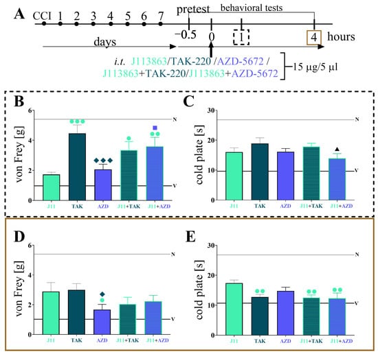 Comparison of the effects of intrathecal (i.t.) administration of substances targeting CCR1 (J113863), CCR5 (TAK-220 or AZD-5672), and their combination (J11 + TAK-220 or J11 + AZD-5672) at a dose of 15 µg/5 µL (timeline (A)) on mechanical and thermal hypersensitivity measured after 1 h (B,C) and after 4 h (D,E), 7 days after chronic CCI in mice. The data are presented as the mean ± SEM (naive n = 5; CCI n = 7–8). The results were evaluated using one-way ANOVA followed by Bonferroni’s post hoc test for comparisons of selected pairs. ● p < 0.05, ●● p < 0.01, and ●●● p < 0.001 indicate significant differences vs. J11-treated group; ♦ p < 0.05 and ♦♦♦ p < 0.001 indicate significant differences vs. TAK-treated group; ■ p < 0.05 indicates significant differences vs. AZD-treated group; and ▲ p < 0.05 indicates significant differences vs. J11 + TAK-treated group. Abbreviations: N: naive; V: vehicle (DMSO); J11: J113863; TAK: TAK-220; AZD: AZD -5672; CCI: chronic constriction injury of the sciatic nerve.