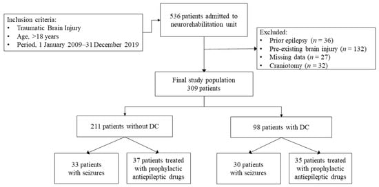 This observational retrospective cohort study enrolled 309 patients with traumatic brain injury (TBI), consecutively admitted to the Neurorehabilitation Unit of ICS Maugeri of Pavia, Italy between 1 January 2009 and 31 December 2019. The eligibility criteria included: (1) age ≥18 years; (2) a diagnosis of TBI; (3) admission to a hospital emergency unit within 24 h of the traumatic event; (4) primary DC performed in the acute care setting as a part of their neurocritical management; (5) admission to our rehabilitation unit for an intensive neurorehabilitation program within one week of DC to continue the clinical care and rehabilitation programs started at the acute care units of the province of Pavia. Individuals were excluded from the study if data concerning their acute care were not available. We also excluded patients with pre-existing neurological events or diseases. The study design conformed to the ethical guidelines of the Declaration of Helsinki and was approved by the local Ethical Committee ICS Maugeri (#2214 CE). The participants or authorized representatives signed a written informed consent form.