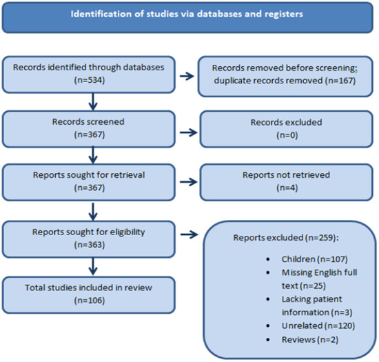 A total of 106 articles regarding PPT in adult patients were included in this study [3,5,6,8,9,11,13,14,15,16,17,18,19,20,21,22,23,24,25,26,27,28,29,30,31,32,33,34,35,36,37,38,39,40,41,42,43,44,45,46,47,48,49,50,51,52,53,54,55,56,57,58,59,60,61,62,63,64,65,66,67,68,69,70,71,72,73,74,75,76,77,78,79,80,81,82,83,84,85,86,87,88,89,90,91,92,93,94,95,96,97,98,99,100,101,102,103,104,105,106,107,108,109,110,111,112]. In total, 125 patients (94 males and 31 females) and their medical records were reviewed. The mean age of all patients was 45.14 ± 18.2 years (95% CI: 49.22–60.84). The minimum age was 17 years and the maximum was 84 years. The mean age of the male and the female patients was 41.88 ± 17.79 and 55.03 ± 15.84, respectively. Age was found to be statistically significant regarding PPT cases between males and females (p < 0.001). A total of 65 patients (52%) had comorbidities, the most frequent being head trauma, cocaine use, dental infections, DM, history of sinus/neurosurgical procedures, or causes of immunosuppression. A total of 72 positive cultures (57.6%) were identified out of all the collected swabs and pus cultures. A single pathogen was isolated from 53 patients’ pus or tissue cultures (42.4%); mixed flora were found in 19 patients (15.2%). For the remaining 53 cases, cultures were negative for pathogens, or the authors did not provide data for them (42.4%). Streptococcus species were present in 28 cultures (22.4%), Staphylococcus species were found in in 24 cultures (19.2%), while 22 other pathogens were isolated from patients’ cultures (17.6%) (Table 1).