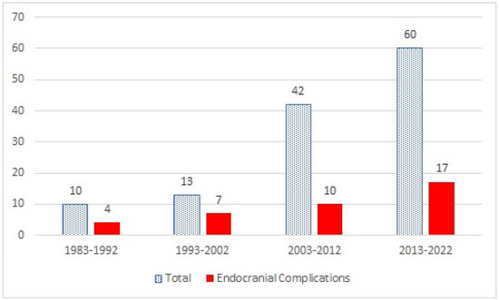 The numbers of patients and intracranial complications are presented for each of the last four decades (Figure 2).