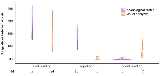 Figure 3 summarizes the rates of migrations between words of the two groups in the different tasks involving word pairs: oral reading, repetition (phonological output without written input) and silent reading (semantic decision on written pairs without phonological output). The two groups had a large rate of between-word migrations in oral reading, both significantly higher than the controls (see Table 1 above), with an average of 19% between-word errors in the phonological output group and 24% in the orthographic input group, with no significant difference between the groups, t(16) = 1.03, p = 0.32, d = 0.52. They crucially differed in the tasks that involved only written input or only phonological output: The orthographic input group made significantly more between-word migrations than the phonological output group in the silent reading task (U = 31.5, p = 0.004), and significantly fewer between-word migrations than the phonological output group in the word pair repetition task (U = 0.000, p < 0.001).