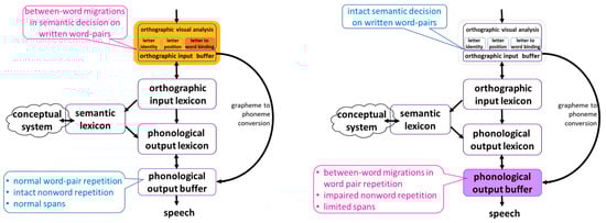 - Morton, J.; Patterson, K.E. A new attempt at an interpretation or, an attempt at a new interpretation. In Deep Dyslexia; Coltheart, M., Patterson, K.E., Marshall, J.C., Eds.; Routledge & Kegan Paul: London, UK, 1980; pp. 91–118. [Google Scholar]