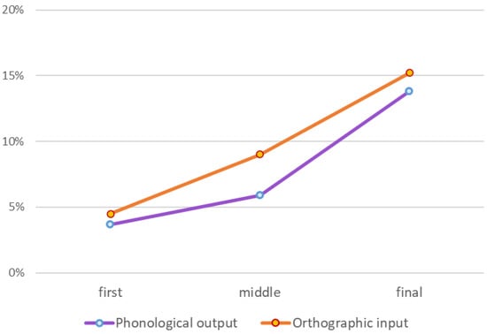 - The effect of the morphological status: is the migrating letter/phoneme part of the root or of a morphological affix? It has been demonstrated that the morphological structure of the word is available both at the stage of orthographic input (see [9,49,50,51,52,53] for findings regarding morphology in dyslexias in this stage, such as letter position dyslexia and neglect dyslexia) and in the phonological output buffer ([31]). Therefore, both stages may be affected by the morphological status of the migrating letter/phoneme.