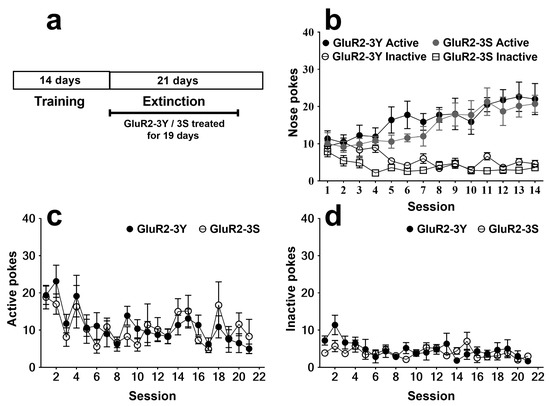 The rats were trained to self-administer morphine for 14 days, followed by 21 consecutive extinction sessions. The 14 rats were administered with GluR2-3Y (n = 7) or GluR2-3S (n = 7) (1.5 nmol/g body weight, i.v.) 60 min before the extinction sessions for the first 19 days.