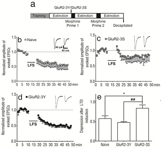 To determine the involvement of synaptic plasticity underlying the attenuating effect of GluR2-3Y on repeated morphine-primed reinstatement, we explored the changes in LTD induced in the NAc shell. Another group of rats was used, and GluR2-3Y and GluR2-3S were injected as before. After reaching the extinction criterion, the rats were anesthetized and decapitated for brain slice preparation (Figure 3a).