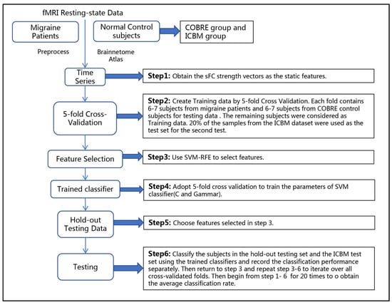 The sFC strength was obtained by adding all absolute values of sFC for the same ROI based on sFC matrix, which was a vector of 246 elements considered as the features. The SVM−RFE method was operated once per cross-validation fold to select the features. A 5-fold cross-validation strategy was used to estimate the generalization of this method for the migraine and the COBRE groups. Based on the features from training data, it was trained as an SVM classifier and then tested on hold-out testing samples from which the same features were selected, followed by a second test using the migraine group test set group and the ICBM group (see Figure 1 for the procedure of this method). Algorithm 1 gives the detailed steps of this method.