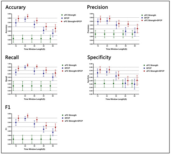 From a statistical analysis perspective, it could be seen from Table 2 that classification based on DFCP and sFC strength + DFCP features significantly outperforms classification based on sFC strength features with the time window length of 12 s, 24 s, and 36 s for classification metrics. Meanwhile, for time window length 48 s and 60 s, the classification metrics including accuracy, recall, and F1 showed there were statistically significant differences between sFC strength and DFCP and the classification metrics including accuracy, precision, recall, and F1 had significant differences between sFC strength and sFC strength + DFCP. Additionally, between DFCP and sFC strength + DFCP, only the accuracy and F1 of 12 s, the recall of 24 s, and the recall and F1 of 36 s had significant differences.
