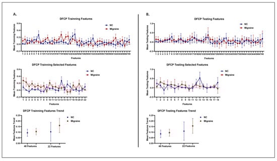 The DFCP features extracted by the algorithm SVM−RFE enabled better differentiation between migraine and normal individuals. From Figure 6A, we could see the detailed information and the trends of DFCP features between NC and migraine. Moreover, it could be displayed that differences in feature trends between NC and migraine in selected DFCP features station using SVM−RFE algorithm was greater than in all DFCP features station from the middle and bottom plots. Moreover, the p-value between the NC mean line and the migraine mean line was 0.6334 for all features and was 0.3497 for selected features which also implied the features were more diverse in selected features. Similar results in the testing set were found and shown in Figure 6B. Here, the p-value between the NC mean line and the migraine mean line was 0.6219 for all features and was 0.3970 for selected features. In Figure S2, the mean p-value of 48 DFCP features between NC and migraine in the training set is 0.205, while the confidence interval was [0.124 0.286]; the mean p-value of 22 DFCP features between NC and migraine in the training set is 0.082, while the confidence interval was [0.015 0.149]; the mean p-value of 22 DFCP features between NC and migraine in the training set is 0.331, while the confidence interval was [0.252 0.409]; the mean p-value of 22 DFCP features between NC and migraine in the training set is 0.306, while the confidence interval was [0.182 0.429]. From the distribution of the p value, it could also be concluded that the selected features were more discriminatory between migraine and normal individuals than all features.