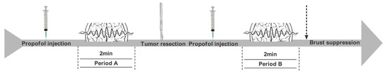 ECoG recording and assessing; Period A (about 2 min) after the propofol bolus (0.01 mg/kg) but before lesion resection; Period B (about 2 min) after lesion resection and the propofol bolus (0.01 mg/kg).