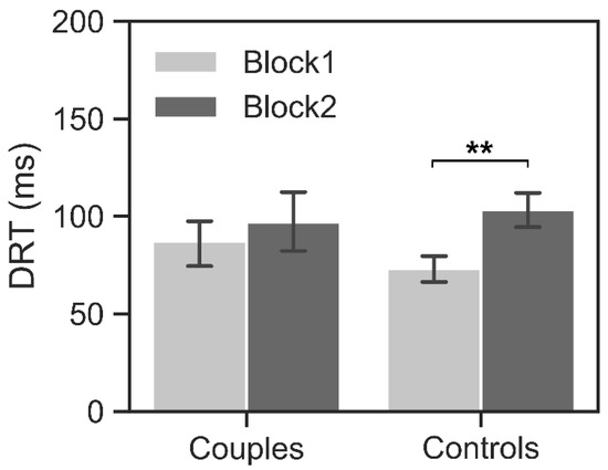 The ANCOVA revealed non-significant main effects of the group and task block (Fs < 1.17, ps > 0.28, < 0.04). The interaction effect between the group and task block was significant (F = 4.85, p = 0.04, 0.14). The simple effect analysis revealed that controls had higher DRT (103.26 ± 40.23) in block 2 than that in block 1 (73.21 ± 27.00; t = 2.61, p = 0.01, Cohen’s d = 2.34; Figure 2). However, there was no significant difference between block 1 and block 2 for couples (87.02 ± 48.37 vs. 96.90 ± 61.14; t = 1.45, p = 0.16, Cohen’s d = 0.82). These results indicated that controls showed a decreased competition across task blocks, but couples could hold the competition with each other.