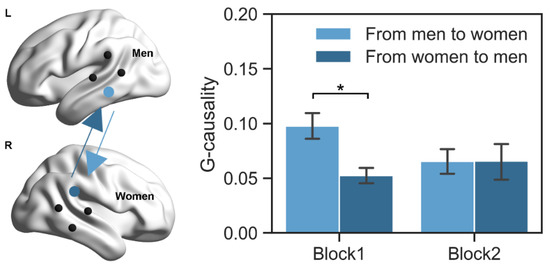 Directional coupling in couples. The G-causality was analyzed in two directions (from men to women, from women to men). Couples showed greater G-causality from men to women (vs. from women to men) in block 1, but no significant difference between the two directions in block 2. * p < 0.05. Black dots indicate the position of optode probes (left). Error bars indicate one standard error of the means (right).