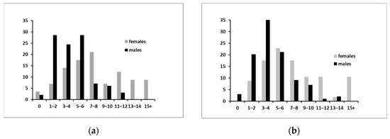In the overall study population, the ESS score distribution among women was shifted towards higher values (Figure 1a), and the median was higher (median = 7, interquartile range (IQ) = 5–11) in respect to men (median = 4, IQ range = 3–8) (Mann–Whitney test = 5.79; p < 0.001); thirteen women and three men had an ESS score equal to or above 11 (p < 0.001).