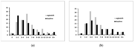 The ESS score and the PSQI score did not vary by working night shifts or fixed daytime shifts (Figure 2a,b) (Mann–Whitney test: ESS = 1.63; p = 0.106; PSQI = −0.19; p = 0.392). Carrying a morning, an evening, or an intermediate chronotype did not make a difference in the prevalence of daytime somnolence, over the total population, and among night shift workers (not shown in the Tables). However, the matutine chronotype was apparently less frequently represented among nightshift workers (males: χ2 = 1.83, p = 0.176; females: χ2 = 0.39, p = 0.534; total: χ2 = 2.18, p = 0.140).