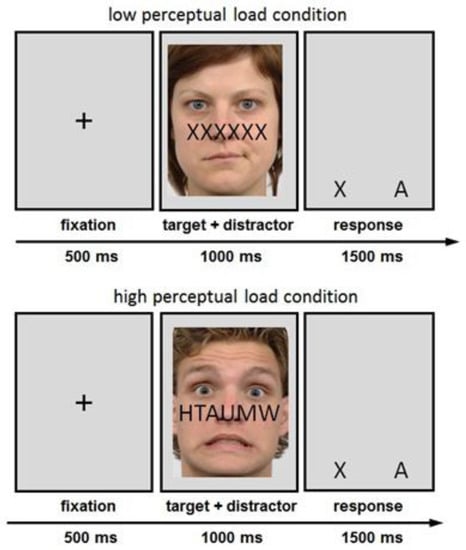 Faces and their emotional content appear to be processed fast and efficiently by the human visual system [29,30]. In general, threat-related stimuli were shown to have an impact on improved behavioral control capabilities [31] and to activate a distributed brain network including the amygdala, insula, and inferior frontal and temporal gyrus; see [32] for an overview. There is evidence that emotional stimuli capture attention involuntarily [33,34] and that their valences are evaluated automatically [35]. However, the automatic processing of emotionally salient stimuli appears to depend on the availability of sufficient attentional resources (e.g., [36,37]). According to the Load Theory ([38,39], see [40] for an overview), the processing of task-irrelevant distractors is prevented when high task demands or a large amount of task-relevant information leave no spare perceptual capacity. In this case, attention to threat distractors is inhibited due to a lack of processing resources. Interestingly, brain responsiveness to emotional face distractors under different perceptual-load conditions has been shown to be modulated by non-clinical [37] and clinical anxiety [41].