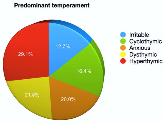 In contrast to categorical bipolar disorders, affective temperaments are continuous, trait-like expressions of affect that are believed to underlie mood psychopathology [9]. A continuum between affective temperaments and mood or anxiety disorders is already under discussion [10]. Evidence from the literature shows that different affective temperament types represent, on the one hand, the subclinical manifestations and, frequently, the precursors of bipolar or depressive disorders, and on the other hand, the predictors of the clinical evolution of major mood disorders, including the direction of polarity and symptom formation of acute affective episodes, thus affecting the long-term course and outcome [11]. In particular, hyperthymic and, to a lesser extent, cyclothymic temperaments seem to be characteristic of bipolar disorder (BD) type I, whereas a dysthymic temperament prevails in depressive disorders [12]. Moreover, dysthymic, cyclothymic, irritable and anxious temperaments are significantly higher in bipolar patients with mixed episodes, while a cyclothymic temperament can also act as a contributing factor in the development of atypical features (appetite and weight gain, hypersomnia, leaden paralysis, interpersonal rejection sensitivity, etc.) in the framework of a major depressive episode [13].