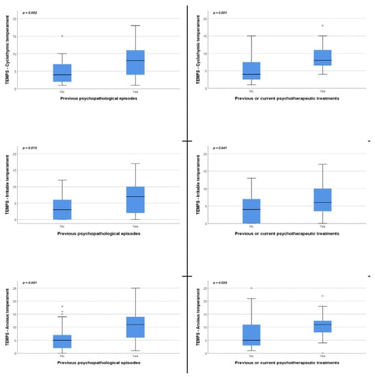 Figure 2. Significant TEMPS-A—psychiatric anamnesis correlations. TEMPS-A: Temperament Evaluation of Memphis, Pisa, Paris and San Diego Autoquestionnaire. Hollow dots represent high or low potential outliers. In the boxplot, top line is the Q3, middle line is Q2, bottom line is Q1, and upper (and lower) whisker extend to maximum (and minimum) data point within 1.5 box heights from top (or bottom) of the box.